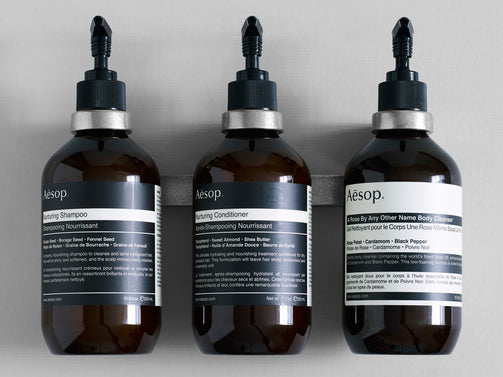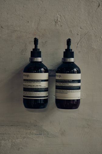 Aesopボトルホルダーはハンドソープやシャンプーなどのボトルを壁などに設置するための器具です。アルミニウムを型に注いで作られており、1本用と2本用と2本用をご用意しております。