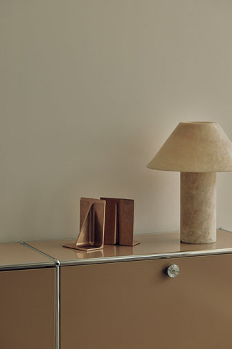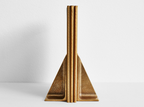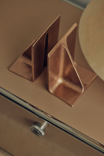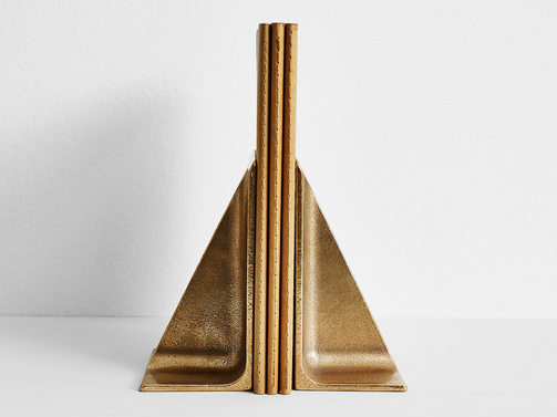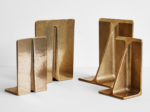 Fin Bookends are manufactured in small batches so slight variations will occur from piece to piece. Production marks may include slight pour ripples or surface pitting. They will arrive with a bright finish but will oxidise and darken over time to reveal a distinctive patina. Simply use a metal polish to restore a like-new finish.
