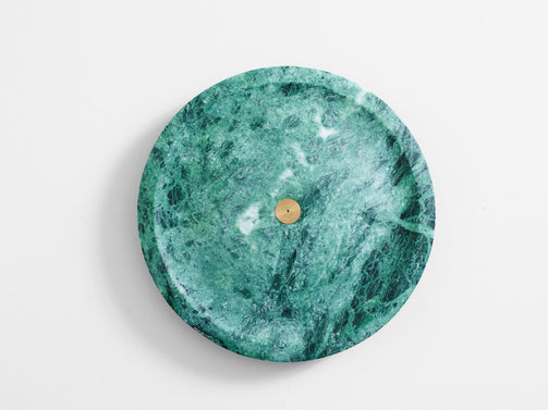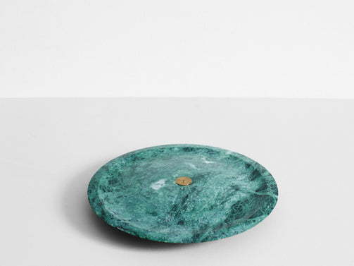 The Incense Plate is carved from solid Green Guatemala marble and uses a central brass insert to hold incense sticks. The insert is double sided, one side for thin incense sticks, and one side for thicker incense sticks.