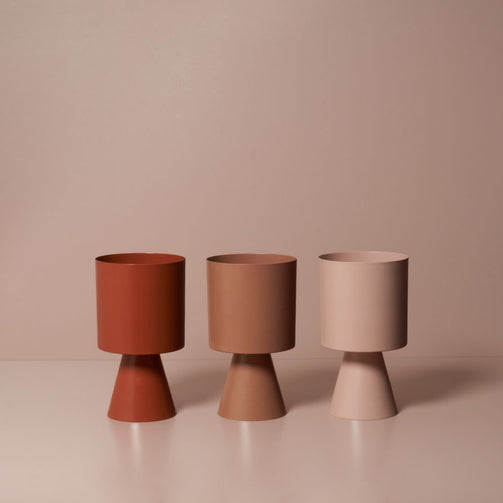The architectural Palm Springs planters, crafted in powder-coated spun metal, explore the relationship between the natural and built environment through colour and form. Ideal for indoor and outdoor use.