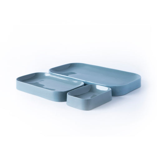 Blue Jadeのシリーズは北欧の色合いと日本の機能性に影響されて作られた製品で、それぞれの皿がパズルの様にぴったりとくっ付く様子は現代の綺麗な食卓にぴったりです。色違いの製品と交換したり組み合わせたりすることもできます。