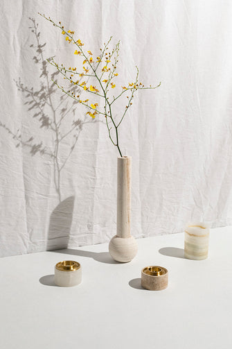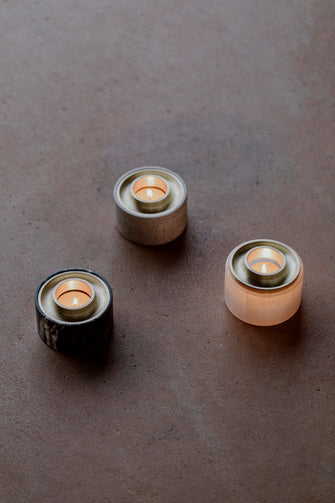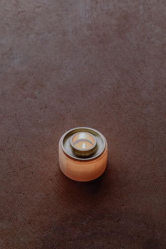 A stone & brass tea light candle holder which acts as a subtle diffuser of essential oils.
