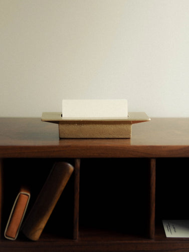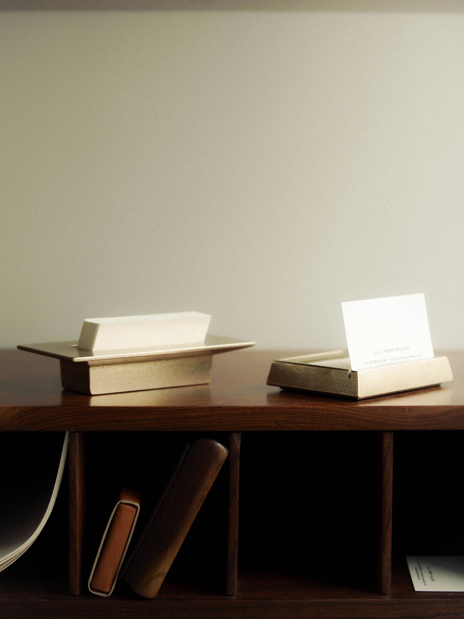 Because the Card Holder is manufactured in small batches, slight variations will occur from one piece to another; production marks may include slight pour ripples or surface pitting. The original finish will oxidise and darken over time to reveal a distinctive patina. If preferred, use a quality metal polish to restore brightness.